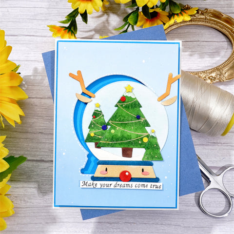 The third one is the Cutting Dies With Christmas Tree Crystal Ball that I want to share with you the most. The Christmas tree is very important for Christmas, and it is absolutely indispensable on Christmas greeting cards. Of course, there are many different types of cutting dies for Christmas trees. Here I will only share one type today. If you want to see more different Christmas trees, you can also go to the shop in kokorosa to see them. The size of this Christmas tree is 4.72*3.14 inches, it is a Christmas tree contained by a crystal ball, our crafters combined the crystal ball with the Christmas tree, and the strong atmosphere of Christmas is also accentuated. Our crafters have also made ingenious ideas on the sides and bottom of the crystal ball. The top is the antlers of the elk, and the base is the eyes and nose of the elk. The cute shape adds a childlike feeling to the Christmas greeting card.