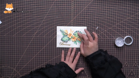 Step 6: In the lower-left corner of the cardstock I put a sticker of "bloom" you can directly use the stamp and gold powder to print the word on the paper