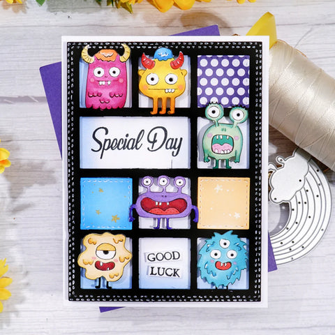 And then there is the second cutting die. This is the Kokorosa Metal Cutting Dies With Hollow Photo Frame, which is a backdrop die, but it is amazing to see how it can be combined with the little monster die to give us a card where each little monster has its place to live. This is the only way to have all the little monsters on the card and still not have it saturated and crowded.