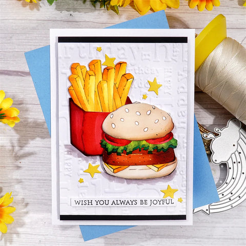 The third is the Kokorosa Metal Cutting Dies With Burger & Fries, a very realistic burger and fries die that is so tempting to look at that you'll want to take a bite out of this card. The need for high-calorie food has been engraved into the DNA of humans since ancient times. Back then, humans needed high-calorie food to survive, and it provided the energy they needed to survive. Nowadays, people are no longer worried about survival, but we still need high-calorie foods because when we see them, it stimulates the secretion of dopamine in the brain, which makes people feel happy. A card like this is meant to convey happiness.