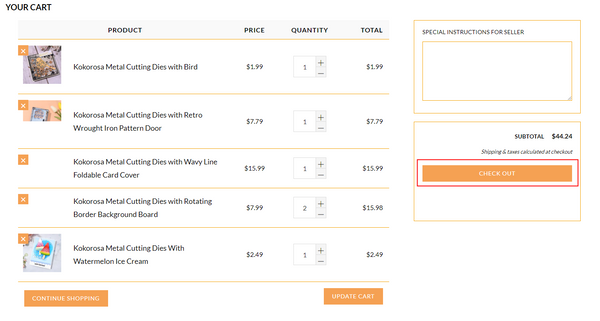 Step 1: Go to the shopping cart page and click on the button of "CHECK OUT".
