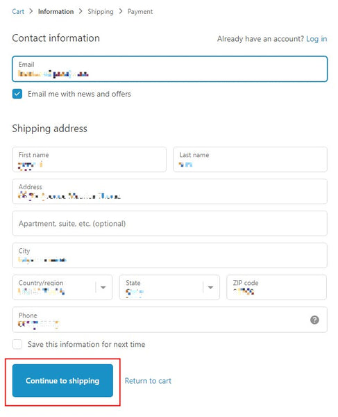 Step 3: Enter your information, click the button of "Continue to Shipping".