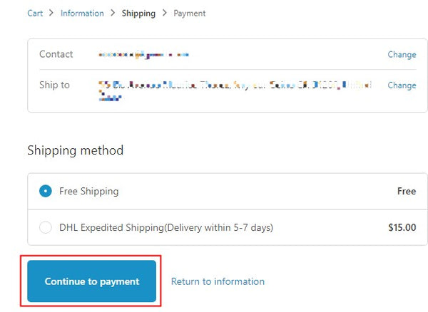 Step 4: Reconfirm your shipping address, contact details and shipping method, click the button of "Continue to payment".