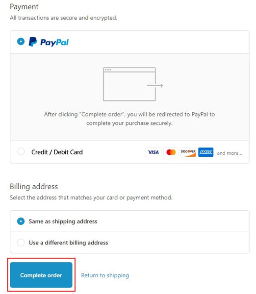 Step 5: Choose your payment method and how to receive Billing, here in PAYPAL, click on the "Complete order" button.